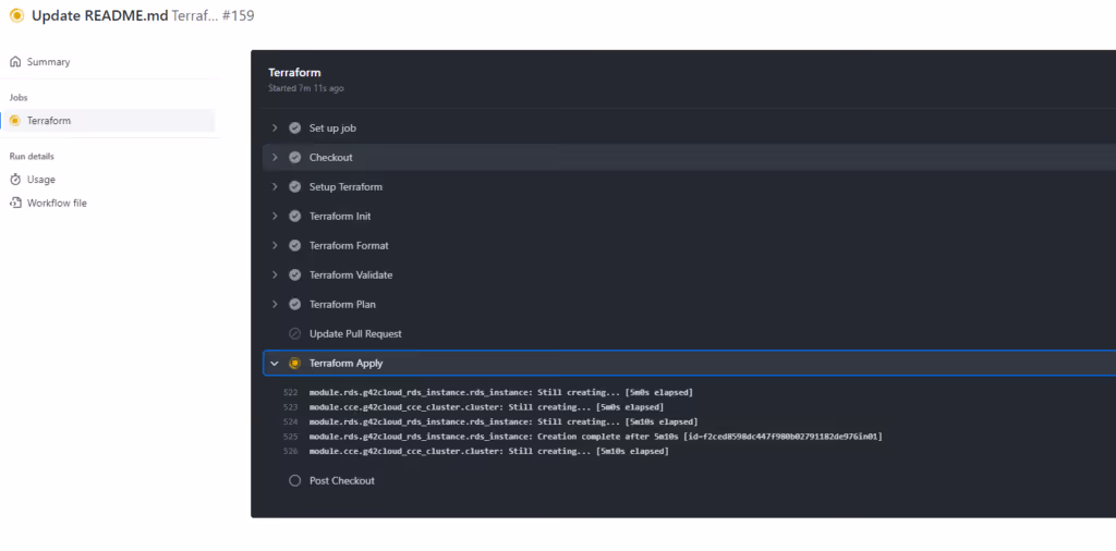 We have covered the general configuration process that is intended to integrate Terraform with GitHub Actions and enable the allocation of your on-premise or cloud infrastructure to a GitHub workflow in a different set of processes on the G42 cloud service. GitHub Actions allow you to automate your workflows to respond to an event in your GitHub repositories. To effectively automate your complex and repetitive workflows, GitHub provides support to Linux, Microsoft Windows, & Mac VMs with the liberty to execute workflows on cloud or on-premise network infrastructures.