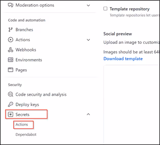 3. Now, to add secrets to your repository, go to Settings on your repository. In the Security section, click on the “Actions” option under the Secrets dropdown menu.